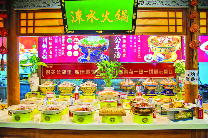 在众多档口中间,有一个档口竖立的红色标志牌格外醒目,上面写着“四菜一汤一饼”展示档口。透过该档口的空隙可以看到,厨师正在将清洗后的土鸡放入锅中汆水。随后,再将处理好的鸡放入石锅内,加汤料熬煮40分钟左右,浇上米醋,一道名为“晋南米醋炖柴鸡”的特色美食就可以上桌了。