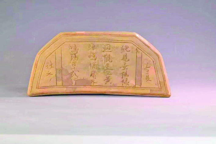 这件宋代黄釉开光四季瓷枕,就是以诗词文字为主的题字枕,很好地反映了当时的社会风貌、文化内涵及制瓷工艺等。其形制为六角形、略呈梯形。枕面及枕侧施以黄釉,底部漏胎。枕底有一孔,用以防止烧制时产生断裂。