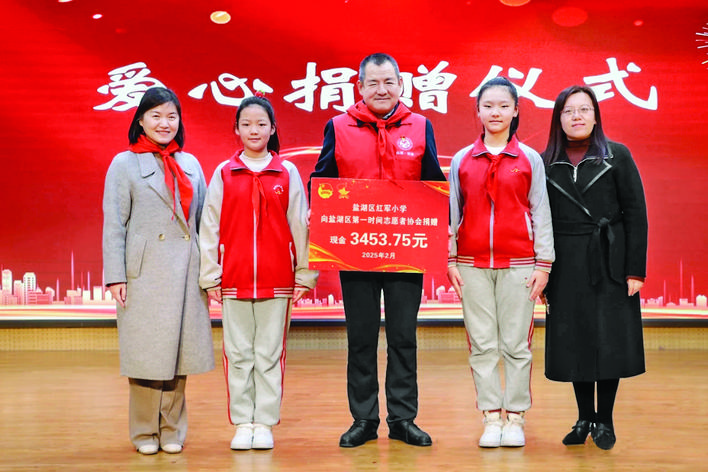 运城晚报讯(记者 杜磊)2月19日,在共青团盐湖区委的支持下,盐湖区红军小学将义卖款项3453.75元捐赠给盐湖区第一时间志愿者协会,用于公益事业(右图)。