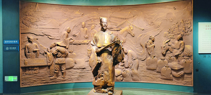 ◀河东池盐博物馆范祥塑像、盐钞运销示意图