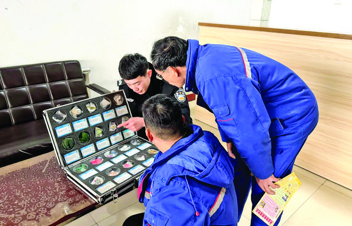 ▲近日,民警为新绛县一加油站员工讲解毒品类型。