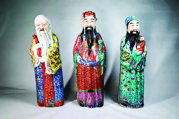 在中国传统文化中,福禄寿三星为我国民间最为喜闻乐见的神仙形象,也是深受人们喜爱和欢迎的吉祥象征,在他们身上承载着丰富的传统文化内涵。福,代表着幸福、福气,是人们对生活美满的期盼;禄,象征着俸禄、官运,反映了古代社会人们对仕途顺遂、功成名就的追求;寿,则寓意着长寿、安康,是人们对生命永恒的衷心祈盼。盐湖区博物馆馆藏的这件粉彩福禄寿三星瓷塑像就将三星汇聚一堂,以艺术的形式将这3种最美好的祝福融合在一起,成为人们寄托情感和祈愿的重要载体。