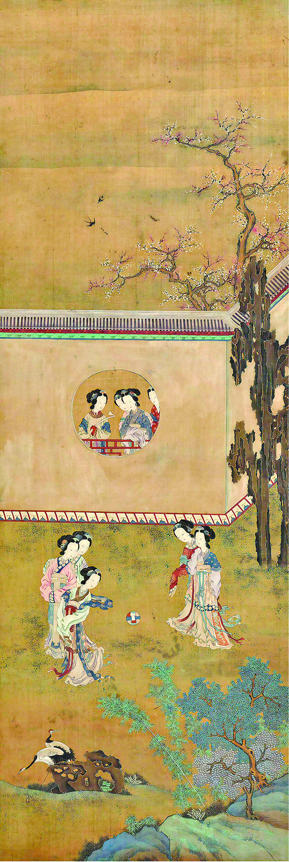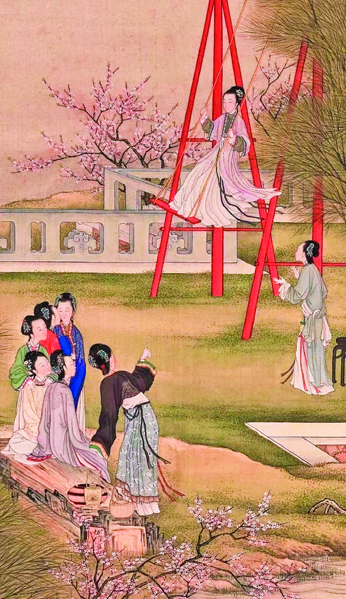 蹴鞠、荡秋千也是特别受古人喜欢的春游游戏。杜甫的《清明》诗中有“十年蹴鞠将雏远,万里秋千风俗同”的句子,可见蹴鞠和秋千在唐朝已成为清明节的代表性运动。明清时期,朝廷甚至直接把“清明节”定为“秋千节”,让宫人、嫔妃相邀嬉戏,享受大好春光。衣带飘飘,配上杏花飞舞,实在是不可多得的美景。
