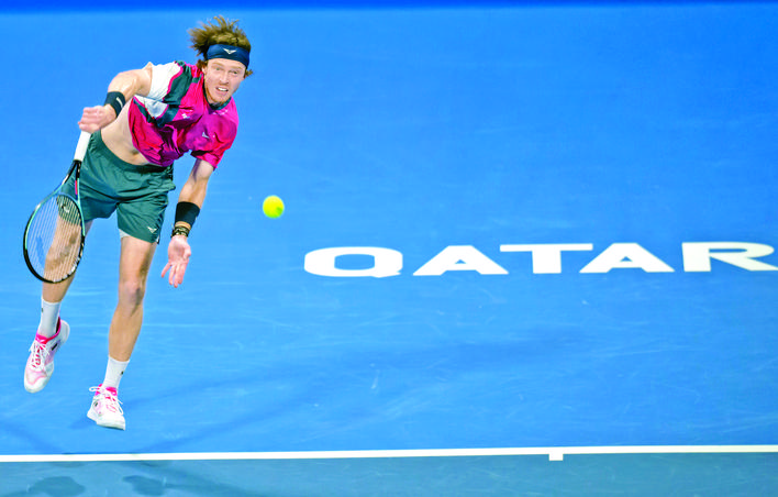 2月22日,卢布列夫在比赛中发球。 当日,在ATP卡塔尔网球公开赛单打决赛中,俄罗斯选手卢布列夫2比1战胜英国选手德雷珀,获得冠军。新华社发