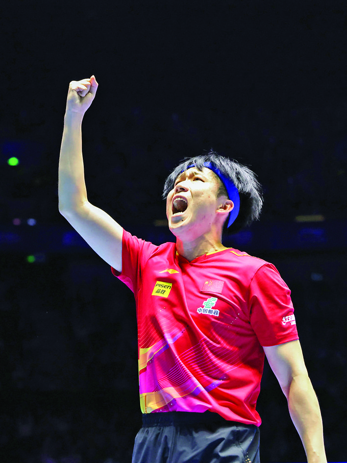 ▲2月23日,王楚钦在比赛中庆祝得分。 当日,在广东深圳举行的第34届国际乒联-亚乒联盟亚洲杯男子单打决赛中,中国选手王楚钦4比0战胜队友梁靖崑,夺得冠军。 新华社记者 梁旭 摄