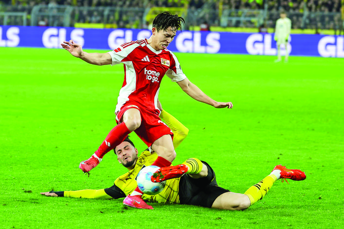 ◀2月22日,多特蒙德队球员本塞拜尼(下)与柏林联合队球员郑优营在比赛中拼抢。当日,在2024-2025赛季德国足球甲级联赛第23轮比赛中,多特蒙德队主场6比0战胜柏林联合队。新华社发