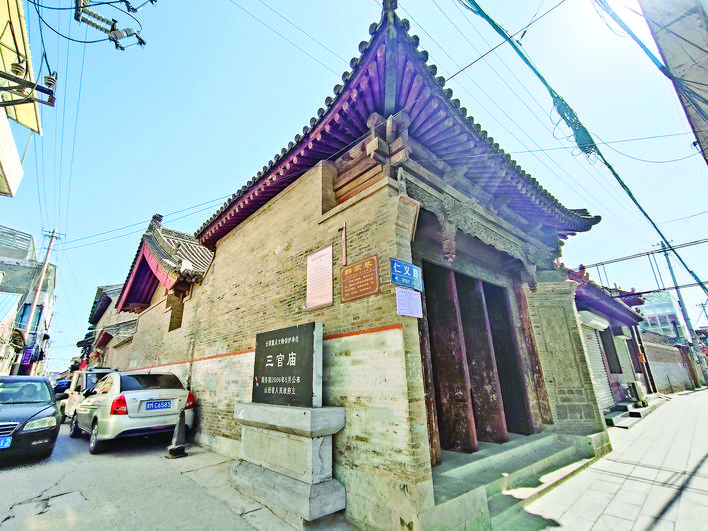 进入大门,就直接进入了献殿。献殿南北墙壁上镶嵌有历代修葺三官庙之碑刻及捐修功德之名录。献殿北墙靠里栅栏内,有两尊斑驳沧桑的塑像,据工作人员介绍,其为最早的天猷、真武原始塑像。从献殿步入大殿,需下三级台阶,也许是时代变迁,街面逐年抬高所致。