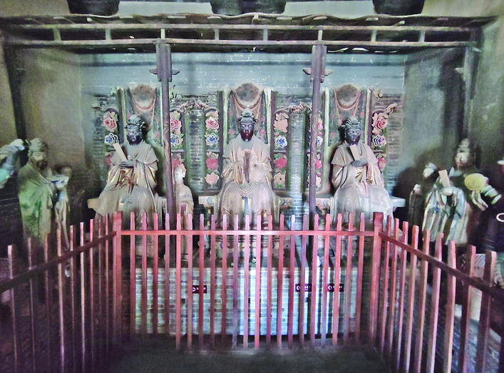 神坛中为元始天尊,北为是太上道君,南为太上老君,三位太祖均倚坐于须弥宝座,足下须弥脚踏。元始天尊头戴天冠,面色黝黑,胡须飘逸,神情凝重,锦袍亮丽,双手合辑,一副心怀人间沧桑之神态。元始天尊双手合辑的心胸中部泥身破损,露出体内木龙骨,上留墨迹“维大元国至正元年”题记,说明三官庙至迟创建于元至正元年。太上道君和太上老君同样金红色锦袍加身,双手紧抱圣牌,庄严肃穆。整个座背墙面花团锦簇,牡丹盛放,高浮雕式的座椅顶部似绣有黑色莲花状头枕,两边有双龙相对。南北两边上方各有一条小龙,很是威武,在悬浮雕花的衬托下显得华贵庄严。