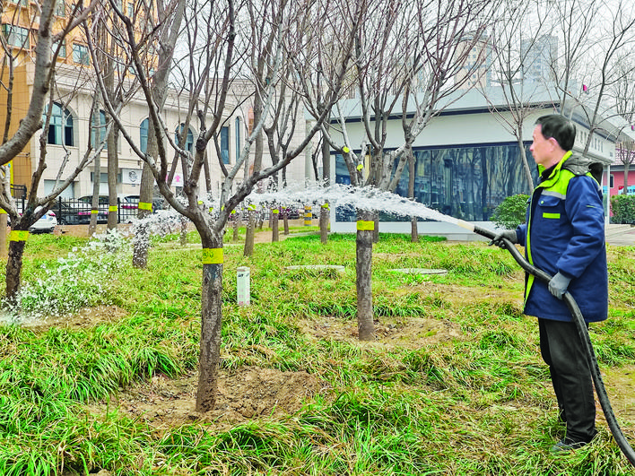“最近气温逐渐回升,绿植又开始了新一轮生长。去年冬天降雪量较少,土壤偏干,所以我们要抓紧时间进行春浇,让绿植喝好今年的第一口水,使其尽快复苏。本轮春浇将持续半个多月,在浇水过程中我们会加入适量肥料,为绿植生长提供充足的水分和养分。”市园林绿化服务中心东片区管护部相关负责人说。