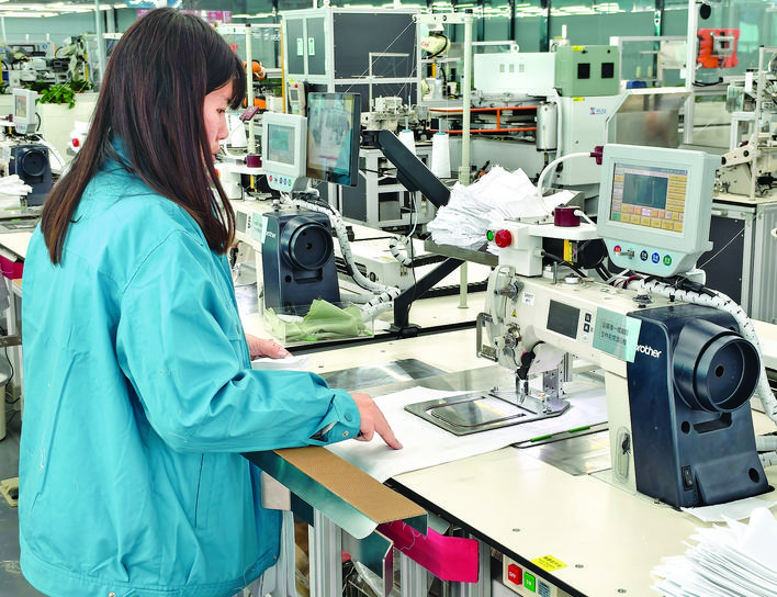 8时整,车间准时响起机器的轰鸣声,一排排制衣机器有序运转,百余名工人在各自的岗位上熟练地进行裁剪、缝纫等作业,呈现出一派繁忙的生产景象。郭霞也开始了她的日常巡视工作,从零部件区域到组合区域,从员工的操作手法到产品的成型效果,她都一一关注。