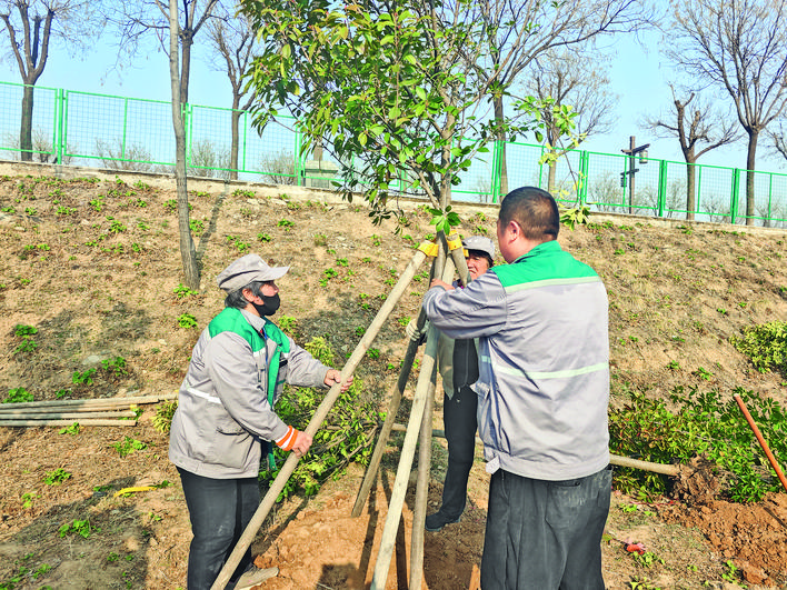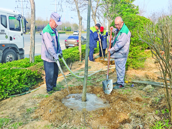 新树栽下后,需要“喝饱水”才能更好地生长。该中心相关负责人介绍,接下来该片区园林工人将在10天内,根据土壤墒情为新树浇3次定根水,确保树木根系稳固。