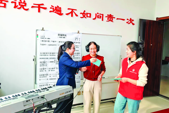 活动现场,居民们抽取写有热门歌曲的卡片,戴上耳机,全情投入哼唱,台下的居民仔细聆听,待哼唱结束,大家抢答猜歌,现场欢笑声、呼喊声此起彼伏。游戏结束后,音乐老师教居民学唱《幸福阳光》。老师耐心示范、居民认真学唱,经过不断学习练习,终于学会了这首歌。