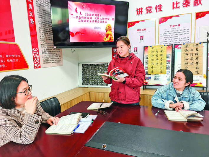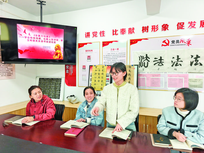 当天,12名居民与县图书馆工作人员、国家二级心理咨询师刘潇及社区工作人员聚集在一起,共同探讨《非暴力沟通》书籍第二章“异化的沟通方式”。