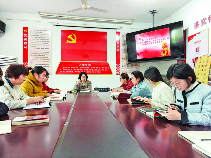 3月11日上午,在临猗县临化社区党群服务中心,居民闫丽萌等人踊跃发言,分享自己的学习心得。