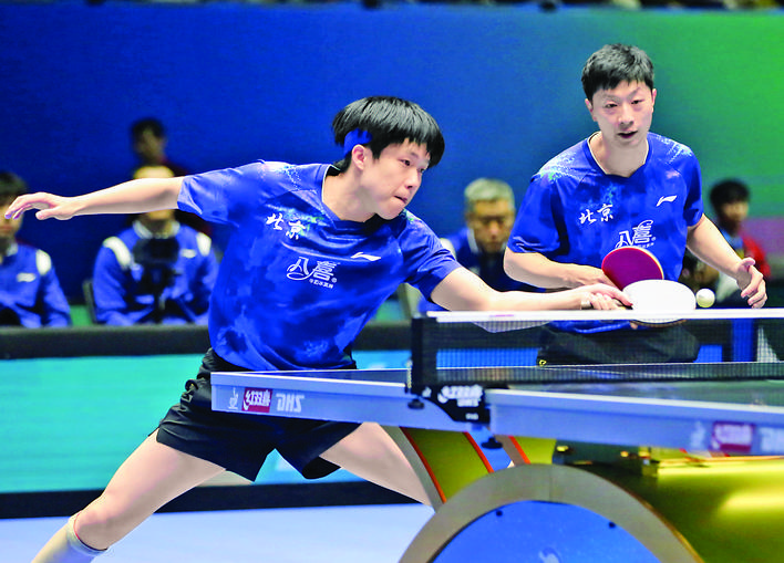 ◀北京八喜队组合马龙/王楚钦(左)在比赛中。他们3比0战胜辽宁队组合杨硕/袁励岑。