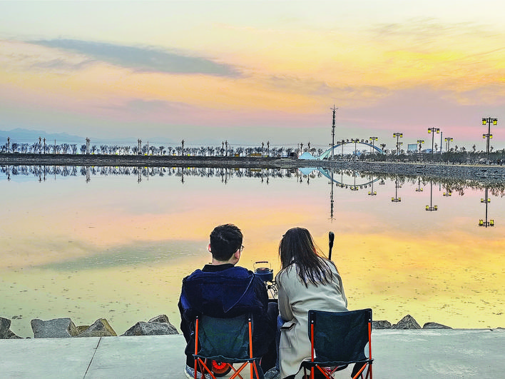 ▲并肩静坐盐湖岸畔,煮一壶香茗,将对生活的无限期许,就着轻柔的晚风,一饮而尽。在七彩盐湖,幸福的具象还有很多…… 记者 赵泽艳 摄