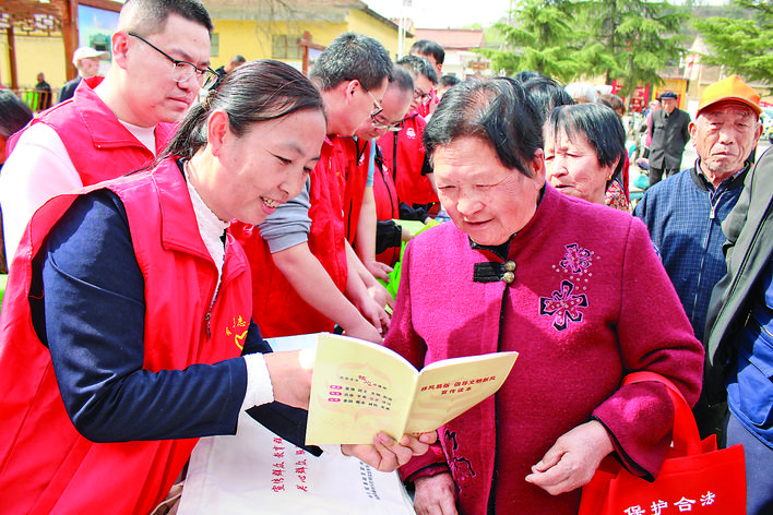 ▲3月26日,在闻喜县革命老区阳隅镇下丁村党群服务中心大院文明集市活动现场,该县阳隅镇、畖底镇和薛店镇的文明实践所志愿服务者,向居民宣传“倡导移风易俗,弘扬时代新风”等有关内容。