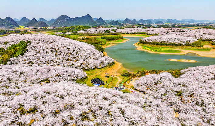 ▶贵州省贵安新区樱花园风景(3月26日摄,无人机照片)。 近日,贵州省贵安新区樱花园内的2.4万亩樱花迎来盛花期,吸引各地游客前来赏花游玩。 贵安新区在提升旅游服务质量的基础上,不断丰富业态,通过“赏花+研学”“赏花+度假”等模式,探索将单一赏花场景升级为复合型文旅体验。2024年,贵安新区樱花园实现综合经济收入313万元。