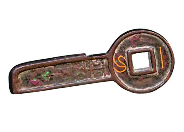 别看这枚货币“个头”小,价值却很大,一枚能当五千枚五铢钱使用,可以称得上是中国古代面值最大的货币。它是王莽改革币制时铸造的一种新的货币。这样一把价值不菲的“金错刀”是中国古代钱币史中的一个异数,也浓缩了王莽改制、时局风涌云动的侧面。