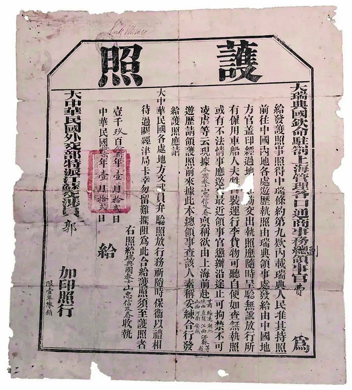 在古代中国,护照有着不同的别称,如度牒、通关文牒等。《西游记》里,唐僧在女儿国请国王签署的通关文牒,便等同于现代护照。当今,护照是我们开启世界之旅的钥匙,是身份与国籍的证明,也是跨国交流的必备证件。但回溯到近一个世纪前的1928年,瑞典教士山忠信及其眷属持有的护照,有着截然不同的意义与背景。