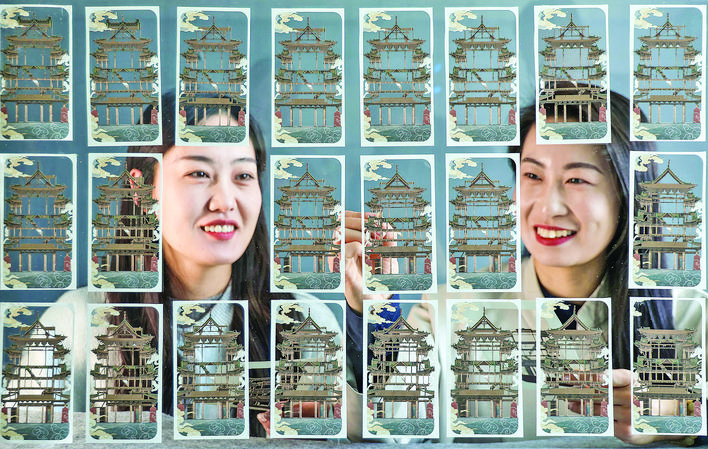 以飞云楼为主题的3D纸雕本是闫琳的代表作之一。采用3D立体雕刻、镂空工艺的纸雕本,168页的厚度完美复刻了飞云楼的精巧斗拱和飞檐翘角,翻开本子,那记忆中的飞云楼仿佛从历史中“站立”起来,生动又震撼。“我们在本子的封面融入了传统的祥云纹,既是对‘半截插在云里头’那句俗语的呼应,也让整体更加具有传统韵味;在本子的背面是一个飞云楼背部的横截面平面图,小时候,顺着这座楼梯,我们还爬到过飞云楼的上面,远眺风景。”她指着镂空雕刻的飞云楼,自豪地介绍着。