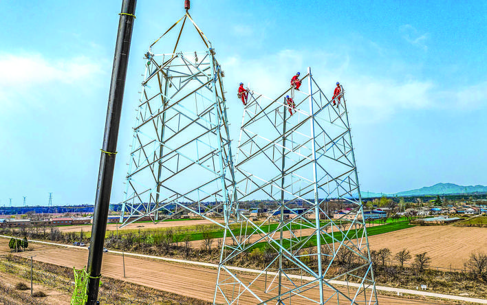 ▶4月3日,国网山西省电力运城供电公司组织施工人员在平陆县张店镇开展组塔作业。 平陆-夏县220千伏线路折单长度83.98千米,新建铁塔146基,途径平陆、夏县两个县5个乡镇。工程建成后可进一步优化运城电网网架结构,增加新能源送出通道,为运城经济发展和优化能源结构提供坚强电力保障。