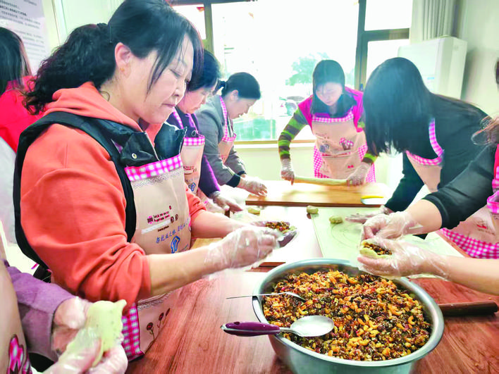 ▶近日,闻喜县太风东街社区工作人员和居民在包枣蛋。