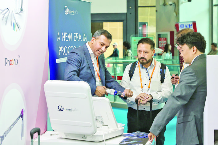 ▶4月8日,一名展商工作人员(左)在向参观者介绍电动吻合器产品。 当日,第91届中国国际医疗器械博览会(CMEF)在国家会展中心(上海)开幕。来自全球30多个国家和地区的近5000家行业企业,在医学影像、体外诊断、医用电子、医用光学、医院建设等22大主题展区内集中展示医疗器械领域全科室、全产业链产品技术与解决方案。 新华社记者