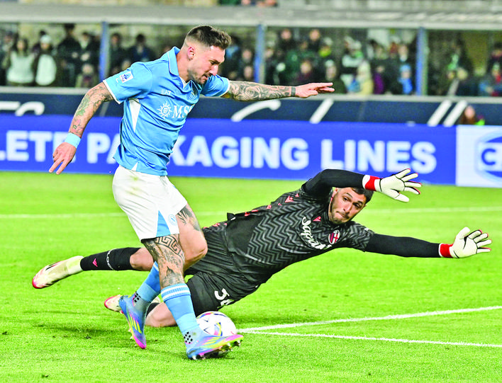 ◀4月7日,博洛尼亚队守门员拉瓦吉亚(右)与那不勒斯队球员波利塔诺在比赛中拼抢。 当日,在2024~2025赛季意大利足球甲级联赛第31轮比赛中,博洛尼亚队主场1比1战平那不勒斯队。