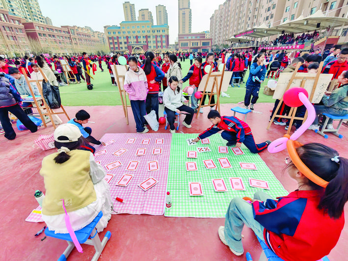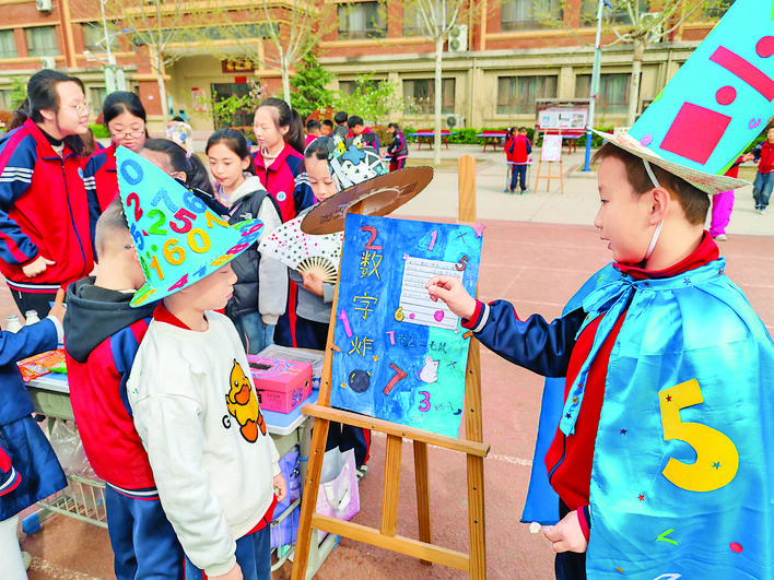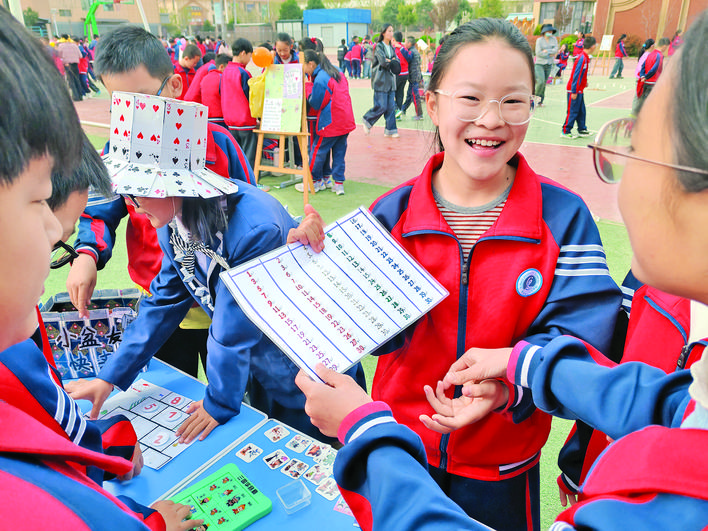 “在去掉大小王的扑克牌中任意抽取4张牌,开动脑筋,让牌面4个数字的运算结果等于24。”24点游戏、数学大富翁、趣味套圈……有趣的小游戏让小朋友们沉浸在数学的世界。五年级学生王舒卉说:“这些游戏内容都是我们自己设计的,在大家互相交流、不断改进的过程中,更能感受到数学的乐趣。”