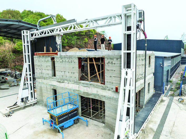 ▼4月9日拍摄的3D打印机建设的双层小楼(无人机照片)。 近日,在湖北宜昌三峡大学3D打印研发基地试验场,一栋由学校自行研发的12米级龙门式建筑3D打印机建设的双层小楼实现封顶,目前正在进行斜坡屋顶的施工安装。这栋双层小楼高8米,占地100平方米,比传统建造工期缩短约70%,打印的效率和完整性达到预期效果。 新华社记者 肖艺九 摄