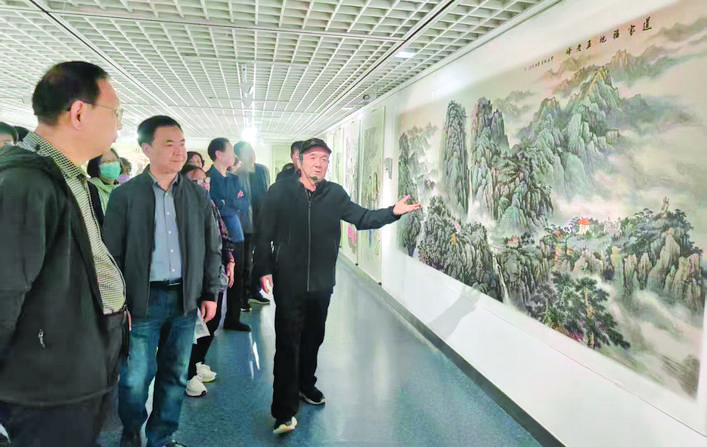 在永济这片浸润着“舜风唐韵·诗画锦绣”的文化厚土上,张军社以砚田为纸、岁月为墨,耕耘书画艺术四十余春秋,先后创作出近千幅艺术佳作。此次展出的百余幅作品涵盖山水、人物、文物等题材,其中《蒲坂揽腾》气吞山河、雄浑壮美,尺寸为150cm×360cm,中条山的苍翠叠嶂、九曲黄河的水流不息、鹳雀楼的雄伟壮观等美景尽收眼底;尺寸为150cm×360cm的《问道五老峰》以书入画的笔法,让峰峦暗藏金石气韵,画中五座雄伟山峰紧密相依,但又峰头林立,如同五位老者礼宾列坐侃侃而谈;各种场景的人物画不拘泥于形似,更重于神似,或用寥寥数笔勾勒出人物的灵动身姿,或借浓淡相宜的墨色晕染出人物的神韵气质,现场观众交口称誉,好评不断。