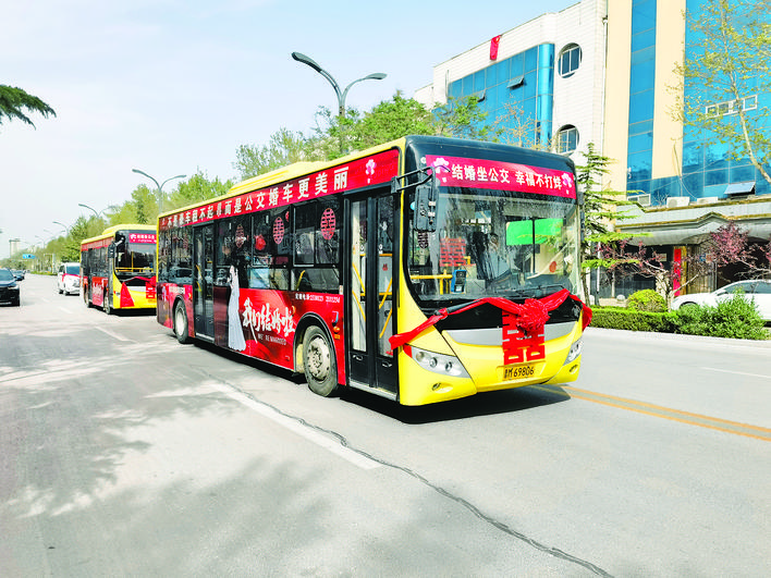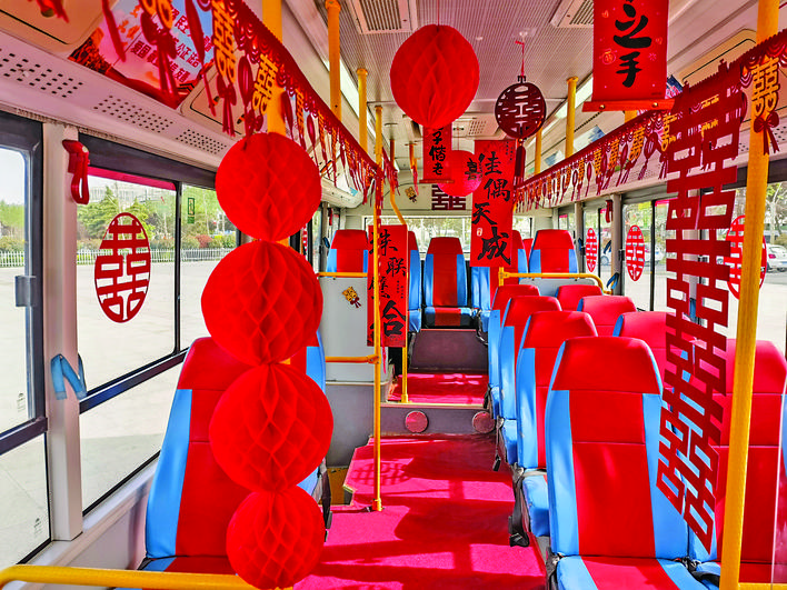 4月12日,行进在临猗县城大街上的两辆公交车引起了人们的关注。但见大囍字、红绸带及“我们结婚啦”等海报布满车身;车内,红地毯、红灯笼及“佳偶天成”“珠联璧合”等祝福语随处可见。