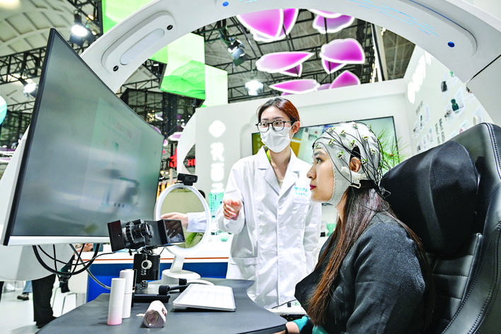 ▲4月13日,展商在消博会现场展示美妆多维全息AI感官行为研究系统,可检测用户对美妆产品满意度。 当日,第五届中国国际消费品博览会在海南举办。本届消博会有全球70多个国家和地区的1700余家企业、4100余个品牌参展。新华社记者 郭程 摄