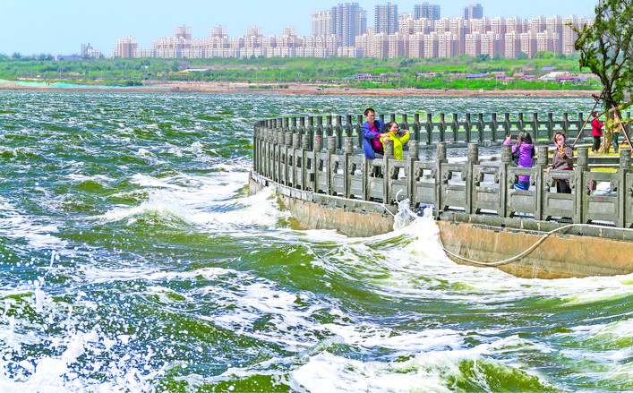 当日,风吹盐湖,浪涛汹涌,这一仿佛大海边的景观,吸引了众多游客前来观赏游玩。