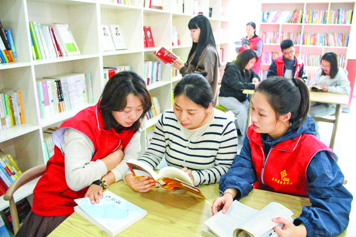 ▲4月16日,闻喜县社区服务中心东城社区工作人员和居民在河东书房内阅读。