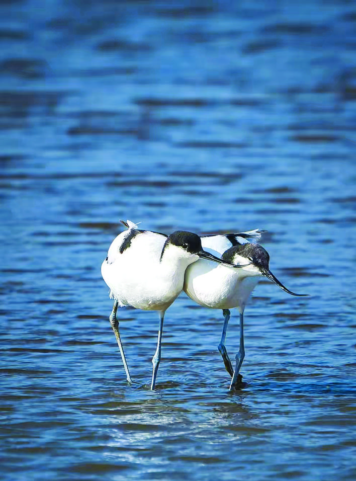 清晨7时许,盐湖22号堤埝两侧,成千上万只反嘴鹬与黑翅长脚鹬在晨练人群周围,时而低飞掠过水面,时而驻足泥滩,时而结伴漫步,黑色羽翼在湖面投射出流动的几何光影。