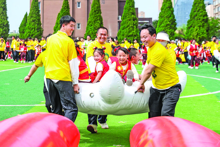 ▲4月18日,盐湖区第二实验幼儿园的学生和家长在参与亲子运动。 当天,该园举办“幼有童趣·吒出活力”亲子趣味运动会,孩子们和家长一起在跳圈、滚桶等项目比赛中体验运动快乐,增进交流,家校联手促进孩子们健康成长。记者 茹雅 摄