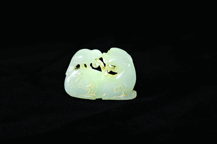 从雕刻工艺来说,明代玉器的工艺特点在这件白玉衔鸟佩上体现得十分显著。明代玉器流行“粗大明”的艺术风格。这里的“粗”并非粗糙,而是一种简洁大气、注重整体造型的艺术处理方式;“大”则强调作品的大气磅礴与豪放洒脱;“明”则指工艺的明快、明朗。再看这枚明代白玉禽鸟佩,线条简洁流畅却又刚劲有力,瑞兽的毛发、羽翼及身上的纹饰,皆以简洁的线条勾勒,却能生动地表现出物体的质感与形态,栩栩如生。