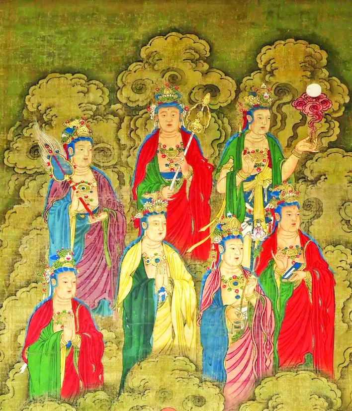 画面分上下两层,布局精巧,层次分明,营造出庄重神圣的宗教氛围。上层绘有欢喜地菩萨、难胜地菩萨、普贤菩萨、势至菩萨等7位菩萨。菩萨们头戴宝冠,冠饰细节丰富,镶嵌着各式宝石,象征着超凡智慧与神圣地位;身着袈裟,袈裟的纹理线条流畅,色彩鲜艳且多样,但又不失庄重,随风飘动,尽显灵动;胸前佩戴璎珞,璎珞的珠子圆润饱满,制作精良,璀璨夺目。他们姿态各异,有的手执独特造型法器,有深刻的佛教寓意;有的双手合十,神态宁静祥和,流露着慈悲与智慧,更添华丽庄严。