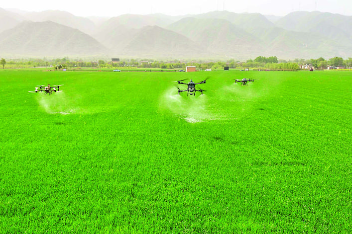 ▶4月17日,在盐湖区曲村小麦种植基地,农户使用无人机对小麦进行施肥作业。 眼下正值小麦生长最旺盛的阶段,农户加强对春季小麦管护作业,确保麦苗健康成长,为夏粮增产丰收蓄势赋能。