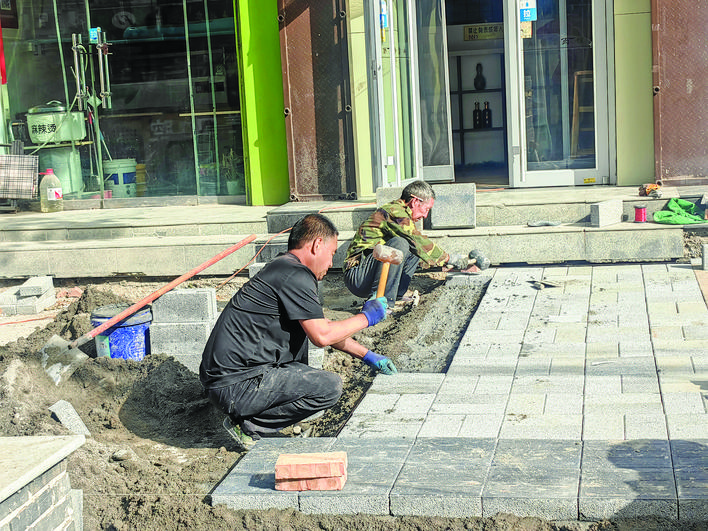 ▲4月23日,在中心城区老东街(人民路至中银路段)人行道上,市政工人在铺设新型透水砖。
