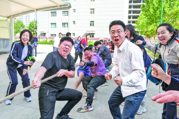 简短的开幕仪式后,比赛正式开始。运动会首个项目拔河比赛便将运动会推向高潮。参赛队伍按部门分为四组,各队队员摩拳擦掌、跃跃欲试。随着裁判一声哨响,选手们迅速进入状态,他们双脚蹬地、身体后倾,双手像铁钳般紧紧握住长绳。双方你来我往,僵持不下,红绸标记在中线附近来回移动。场边啦啦队热情高涨,挥舞着自制的加油牌,此起彼伏的“加油”声震耳欲聋。