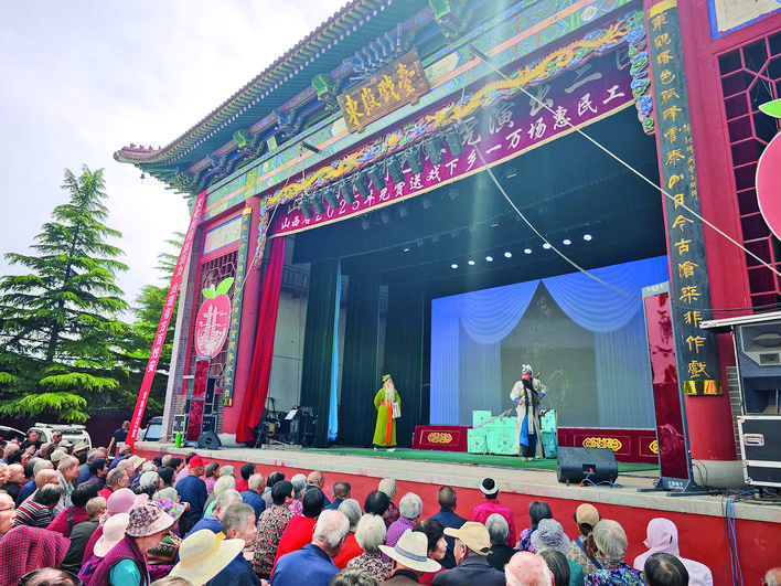 ▲4月24日至26日,临猗县北景乡东陈翟村举办第25届“东岳戏剧文化节”,戏曲演出等文化活动亮点纷呈。这是山西省蒲剧艺术院演出二团演出现场。翟建锋 摄