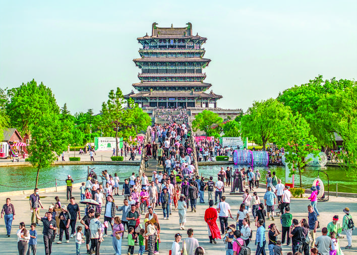 ▲5月3日,游人在永济鹳雀楼景区游玩。 “五一”假期,鹳雀楼景区游人如织,来自全国各地的游客纷纷登楼远眺,感受“白日依山尽,黄河入海流”的壮丽景象。 记者 薛俊 摄