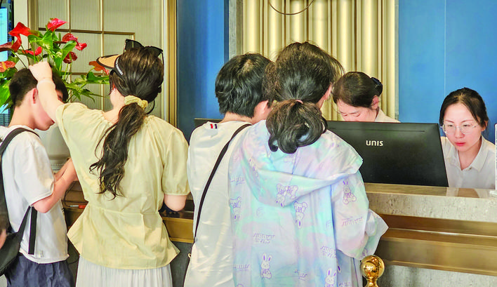 李先生一家从西安自驾,在运旅游的第一站是永济市,住宿地点选在了面山临湖的听涛阁。当天,大厅内的游客人来人往,或选购文创产品,或办理入住,大家在工作人员和志愿者的引导下有序活动。