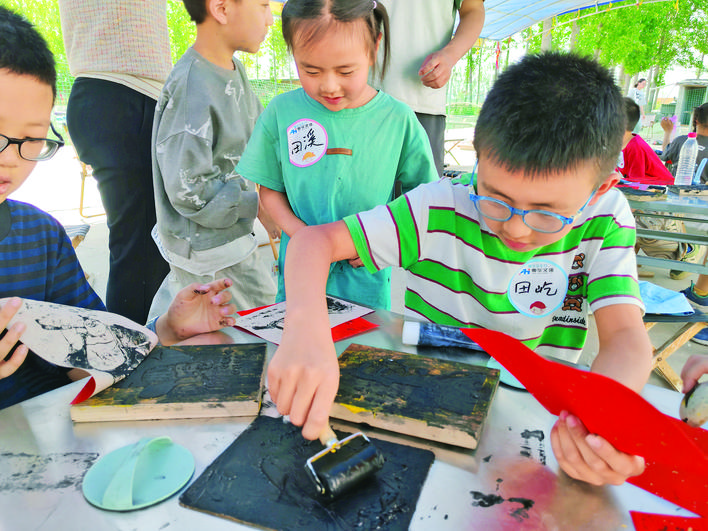 木版年画工坊内,矿物颜料与古老雕版碰撞出文化火花。少年们手持滚压轴,在年画模板上涂刷颜料,非遗老师现场讲解传统技艺背后的匠心。“每一笔都要稳,就像农民伯伯插秧一样认真。”小学员专注的神情,映照着传统文化在新时代少年手中的鲜活传承。