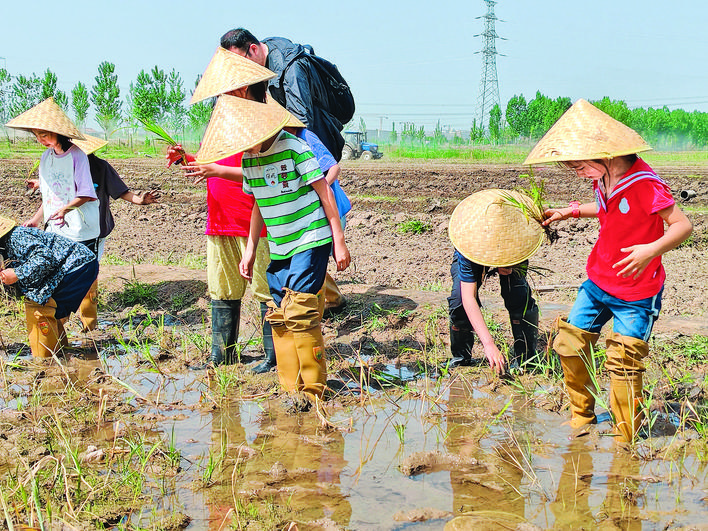 “原来秧苗要横成列、竖成行!”烈日下,孩子们赤脚踏入水田,在农技老师的指导下学习分苗、插秧。35℃的高温中,少年们人均弯腰200余次,指尖与泥土的每一次触碰,都是对“粒粒皆辛苦”的具象化理解。