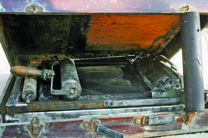 油印机长56厘米,宽38厘米,高13厘米,机身棕黑色,两个滚子依然完好。