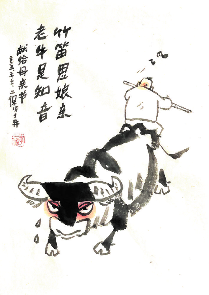 ◀竹笛思娘亲 老牛是知音 李二保(山西)